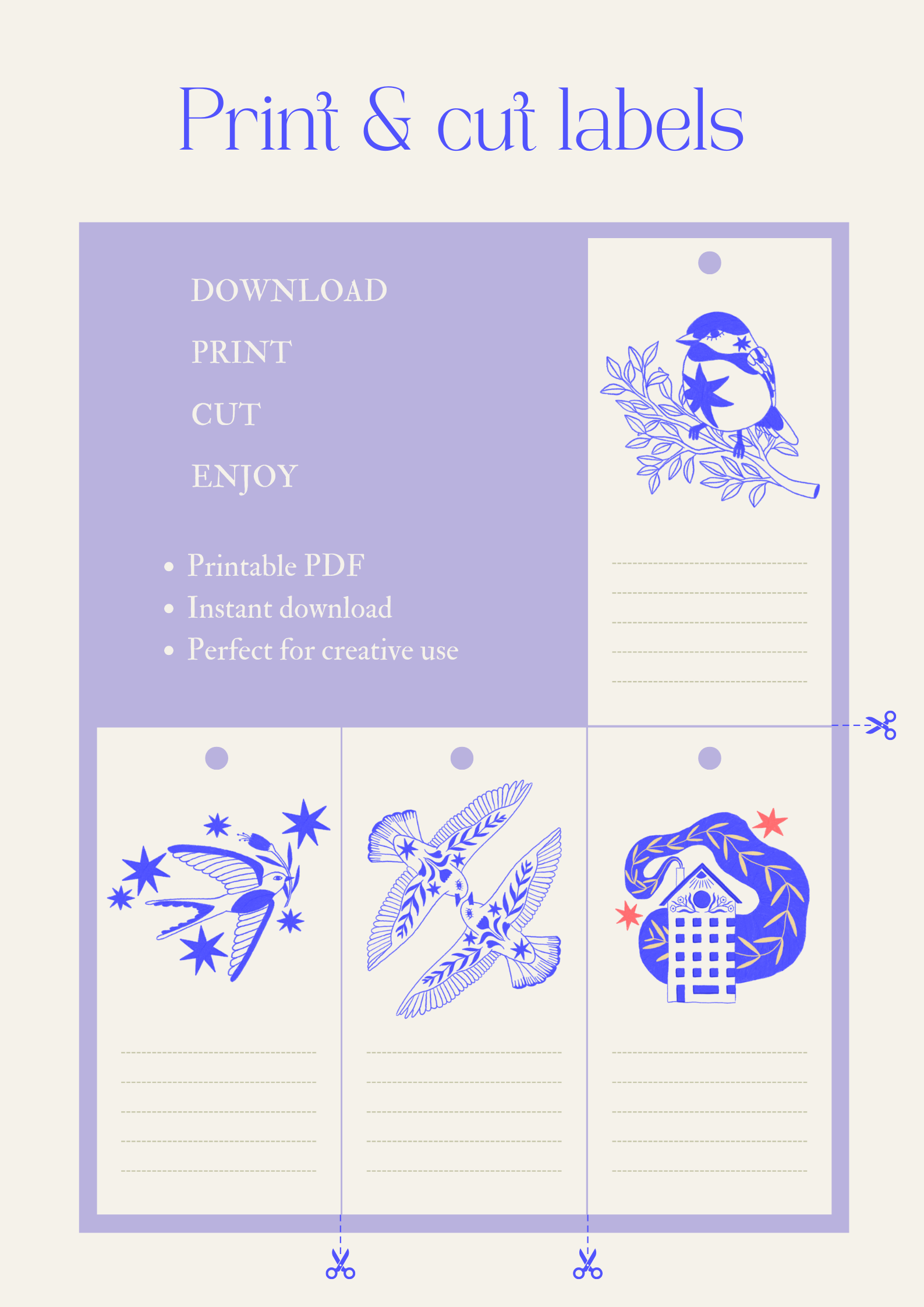 The PDF includes a set of labels, perfect for packaging, planners, journals, small businesses and DIY creations.